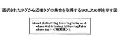 図22はタグ提示画面112の領域112bで近接タグを表示するにあたり、選択されたタグから近接タグの集合を取得するSQL文の例を示す図である。図22の例は、選択されたタグを検索語として、その検索語にタグ文字列が合致するタグIdをタグ表(tagTable)284から求め、その中から近接タグ(A)を抽出するようにしている。その他、現在のタグと共通するファイルの比率が高いものほど近接度が高いものとすることができる。  FIG. 22 is a diagram illustrating an example of an SQL sentence for acquiring a set of proximity tags from a selected tag when displaying a proximity tag in the area 112b of the