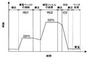 上記3段階のプロファイルを制御するため、図1の真空熱プレス装置200では、図5に示すように、第1加圧加熱ユニットHU1の加熱温度を導電ペースト4の焼結温度220℃に設定し、第2加圧加熱ユニットHU2の加熱温度を熱可塑性樹脂からなる樹脂フィルム20a〜20fの融着温度320℃に設定し、加圧冷却ユニットCUを冷却成形処理に用いている。このように、図1の真空熱プレス装置200は、第1加圧加熱ユニットHU1と第2加圧加熱ユニットHU2について、それぞれ導電ペースト4の焼結と樹脂フィルム20a〜20fの融着の各処理に適した温度と圧力を設定することができる。  In order to control the above three-stage profile, the vacuum