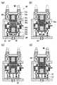 図1の真空熱プレス装置200における第1加圧加熱ユニットHU1と第2加圧加熱ユニットHU2は、それぞれ、前述した(1)の導電ペースト4の乾燥および焼結段階と(2)の樹脂フィルム20a〜20f同士の融着段階を実施する部分である。従って、第1加圧加熱ユニットHU1と第2加圧加熱ユニットHU2では、図3の基本構造Uにおける上側加圧プレート50uと下側加圧プレート50dに、加熱ヒータHが設けてあり、上側加圧プレート50uと下側加圧プレート50dが熱盤となっている。一方、図1の真空熱プレス装置200における加圧冷却ユニットCUは、前述した(3)の冷却成形段階を実施する部分である。従って、加圧冷却ユニットCUでは、図3の基本構造Uにおける上側加圧プレート50uと下側加圧プレート50dに、冷却水Cが導入される構造となっている。また、上記加圧プレート50u,50dの周りには断熱壁DWが設けられており、断熱壁DWの構成も各ユニットHU1,HU2,CUで異なる。しかしながら、図1の真空熱プレス装置200において、加圧プレート50u,50dと断熱壁DW以外の主な構成、例えば加圧プレート50u,50dの昇降機構の構成は、各ユニットHU1,HU2,CU共に、図3と図4に示した共通の構成となっている。  The first pressurizing and heating unit HU1 and the second pressurizing and heating unit HU2 in the vacuum