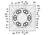 また、成形型300に充填される絶縁樹脂材は各ティース32の外周面に形成された溝36にも充填されるので、各ティース32は成形圧により内型304に向けて押し付けられる。その結果、各ティース32の回転子80側の内周面は、内型304の外周面に沿って円周上に整列する。したがって、エンドカバー46を成形後に、ステータコア30と永久磁石84との間に形成されるギャップを、回転方向に均一にすることができる。  Further, since the insulating resin material filled in the