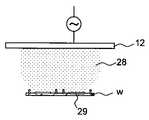 このような状態で、高周波電源21より上部電極12に例えば13.56MHzの高周波電圧を、下部電極13は接地し、500Wで放電を行う。このような高周波を印加すると、特に放電開始時(プラズマイグナイト時)は、ガスフロー中にプラズマが形成されるため、分子であったガスの乖離により体積膨張を生じ、一時的に反応室11内の圧力が増加する。そこで、圧力増加を補正するために、排気量調整バルブ15により排気量が自動的に調整されるが、このとき圧力変動が生じるため、図2に模式図を示すように、プラズマ27が不安定になり、ウェハw上のプラズマが不均一になる。この状態でプラズマ処理を行うと、図3に模式図を示すように、プラズマ28の不均一よりウェハw上にチャージアップ29が形成され、プラズマダメージを生じさせる。また、プラズマがウェハw上で均一でないことにより、チャージアップの不均一も生じる。それが加速要因となり、プラズマダメージが発生しやすくなる。  In such a state, a high frequency voltage of, for example, 13.56 MHz is applied from the high