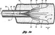 図9aおよび図9bは下大静脈52からフィルタ10を取出す手順に使用されている回収装置65の一部を示している。この回収装置65は頸静脈を経て上大静脈に経皮的に導入される。この手順では、回収装置65の回収カテーテルまたはシース68を上大静脈に挿入する。遠位端部にループスネア72を有するワイヤ70を回収シース68に通し、そしてシース68の遠位端部から出す。次いで、ループスネア72がフィルタ10の取出しフック46を捕捉するように、任意の適当な手段により回収装置の近位端部からワイヤ70を操作する。シース68を押しながらワイヤ70を引く反対牽引法によって、シース68をフィルタ10に外挿させる。シース68がフィルタ10に外挿されると、一次ストラット12、次いで二次ストラット30はシース68の縁部に係合し、フィルタの長さ方向軸線に向けてハブ11のところで回動するか、或いは曲げ撓みを受ける。長さ方向軸線に向かう回動により、ストラット12および30の端部を血管壁から引っ込める。このようにして、回収手順において血管壁に表面損傷74および小さい点損傷76のみが生じる。図示のように、表面損傷74は二次ストラット30の端部により生じ、小さい点損傷76は一次ストラット12のアンカーフック26により生じる。しかしながら、フィルタを患者から回収する他の任意適当な手順を実施してもよいことを理解されたい。FIGS. 9 a and 9 b show a portion of the collection device 65 used in the procedure for removing the
