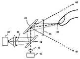 図4はレーザービーム走査光学系の模式図を示している。赤外線マルチレーザービーム発光素子40から照射された赤外線レーザービームはコリメーションレンズ41で平行光線にされてハーフミラー42を透過して、レーザービーム走査用のMEMS(Micro  Electro  Mechanical  Systems)ミラー43で反射され、可視光カットフィルタ窓44を通って手の甲の表面上部を周期的に走査される。  手の甲に指先で接触しているか又は少なくともレーザービームが当たるほど表面に近くに指先がある場合にレーザービームの向きが指先の方向と一致すると、レーザービームで照射された指先からの反射光は照射ビームと同じ光路を経てハーフミラーに戻り、ハーフミラー42で反射されて集光レンズ48で集光されてから受光素子49で電気信号に変換される。FIG. 4 is a schematic diagram of a laser beam scanning optical system. The infrared laser beam emitted from the infrared multi-laser beam
