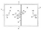 第1部屋16では、間仕切り壁50と平行で一側面50aから離れた側壁11の近くに送信機30が配置され、間仕切り壁50の一側面50aの近くに、送信機30から放射される放射電波を受信する第1受信機40Aが配置されている。これに対して、第2部屋18では、間仕切り壁50と平行で他側面50bから離れた側壁12の近くに、上記送信機30から送信された放射電波を受信する第2受信機40Bが配置されている。  In the