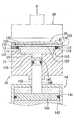 図5は、構造上は第1の望ましい実施例に類似する本発明に従った均等プレス装置の第2の望ましい実施例を示す。第1の望ましい実施例とは対照的に、シリンダ141は、支持容器11に接触し且つそれに対して固定的に取り付けられ、肩部表面114は、裁頭円錐形であり、金属密封リング131は、肩部表面114上に配置される。この実施例において、肩部表面114は、環状上部表面112の内周から取付け表面113の外周まで内方向及び下方向に延在する。金属密封リング131は、ゴム密封リング132と接触する環状内周表面134を有する。  FIG. 5 shows a second preferred embodiment of a uniform press apparatus according to the present invention that is structurally similar to the first preferred embodiment. In contrast to the first preferred embodiment, the