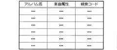 図7は、楽曲属性データベース42aのデータ構造図である。このデータベース42aは、各々が、CDに収録された各アルバムと対応する複数のレコードの集合体である。そして、このデータベースを構成する1つのレコードは、「アルバム名」、「楽曲属性」、及び「検索コード」の3つのフィールドを有する。
