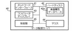 図6は、データ配信サーバ40のハードウェア概略構成を示す図である。図に示すように、データ配信サーバ40は、インターネット93とのデータの遣り取りを司るネットワークインターフェース41、楽曲属性データベース42aを記憶したハードディスク42、各種情報を表示するコンピュータコンピュータディスプレイ43、各種情報を入力するマウス44、及びこれら各部を制御する制御部45を有する。  FIG. 6 is a diagram illustrating a schematic hardware configuration of the