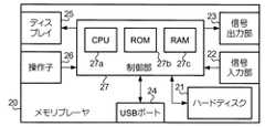 図4は、メモリプレーヤ20の外観を示した図であり、図5はそのハードウェア概略構成を示した図である。メモリプレーヤ20は、記憶装置であるハードディスク21、信号入力部22、信号出力部23、USB(Universal Serial Bus)ポート24、ディスプレイ25、操作子26、及びこれら各部を制御する制御部27を備える。制御部27は、CPU27a、ROM27b、RAM27cなどを内臓している。そして、制御部27のCPU27aは、ROM27bやハードディスク21に記憶された各種のプログラムを実行することによってメモリプレーヤ20の各部を制御する。プログラムには、USBポート24を介した携帯電話30との接続を可能とするためのUSBホストドライバや、携帯電話30を介してのインターネット通信を実現するためのTCP/IP(Transmission Control Protocol/Internet Protocol)ドライバ、ダイヤラおよびモデムコントローラ、音声圧縮・伸長を行うコーデックなどの各種プログラムが含まれる。  FIG. 4 is a diagram showing an external appearance of the
