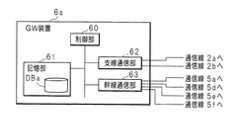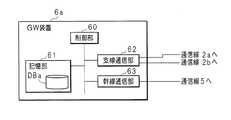 GW装置6aは、各構成部の動作を制御する制御部60と、揮発性のメモリを利用した記憶部61と、支線2a,2bに接続されている支線通信部62と、幹線5に接続されている幹線通信部63とを備えている。なお、記憶部61は揮発性のメモリに限られず、書き換え可能な不揮発性のメモリを利用してもよい。 TheGW device 6a is connected to themain line 5 and acontrol unit 60 that controls the operation of each component unit, astorage unit 61 that uses a volatile memory, a branchline communication unit 62 that is connected to thebranch lines 2a and 2b. The mainline communication unit 63 is provided. Thestorage unit 61 is not limited to a volatile memory, and a rewritable nonvolatile memory may be used.