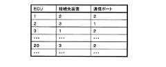 なお、分配装置4に接続されている支線2c,2dに新たにECU1が接続された場合は、分配装置4の制御部40は、新たなECU1から送信されたメッセージを支線通信部42により受信する。制御部40は、受信したメッセージのメッセージIDを読み出し、読み出したメッセージIDの送信元のECU1の接続情報が不明であるか否かを判断する。制御部40は、不明であると判断した場合、自身の装置の識別番号、及びメッセージを受信した通信ポートの識別番号からなる接続情報を追加する。 When theECU 1 is newly connected to thebranch lines 2c and 2d connected to thedistribution device 4, thecontrol unit 40 of thedistribution device 4 receives the message transmitted from thenew ECU 1 by the branchline communication unit 42. . Thecontrol unit 40 reads the message ID of the received message, and determines whether or not the connection information of theECU 1 that is the transmission source of the read message ID is unknown. When it is determined that thecontrol unit 40 is unknown, thecontrol unit 40 adds connection information including the identification number of its own device and the identification number of the communication port that has received the message.