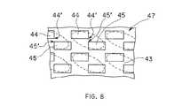上述のように絶縁層によって離間された電極が複数組存在する場合、電極を所定の規則性をもって配置することができる。図7および図8はこのような電極の配置例を示すものであり、図7では、絶縁層43に電極44、45がそれぞれ格子型となるように配置されている表出面47が示されている。また、図8では、絶縁層43に電極44、45がそれぞれ市松型となるように配置されている表出面47が示されている。図8に示される例では、1組の電極を構成する電極44と電極45(図中に鎖線で囲んだ1組の電極)の距離が、各電極のコーナー部44′と45′との間で著しく小さいものとなり、電界強度を大きくすることができ、リセットパルスの電流をより少ないものとすることができる。