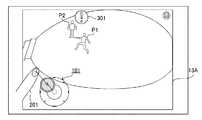 図6は、このときのゲーム画面の例を示す説明図である。図6に示すように、例えばプレイヤPの指201により表示画面13Aの一点が押下されると、押下位置を中心として仮想コントローラ101が表示される。  FIG. 6 is an explanatory diagram showing an example of the game screen at this time. As shown in FIG. 6, for example, when one point of the