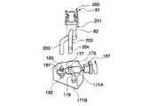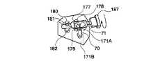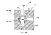 図24に示すように、アタッチメント170は、本体部171と、本体部171に回転自在に挿入される弁体172とを有する。本体部171は、第一の連結管路70を有し、第一の連結管路70には上面171Aに開口する処置具挿入口71が設けられると共に、分岐部72から第一の接続管路73が分岐している。第一の接続管路73は、弁体172が挿入される挿入孔173に連通している。挿入孔173は、大径部175と小径部176とを有する。本体部171において、挿入孔173の大径部175には第一の接続管路73が開口している。さらに、第一の接続管路73の接続位置から周方向に約90°回転した位置には、孔177が形成されている。孔177は、上面171Aに開口すると共に、挿入孔173を越えて下面171Bに向かって延びているが、下面171Bには貫通していない。孔177の挿入孔173から上側が先端側開口部178となり、孔177の挿入孔173から下側が嵌入孔179になる。挿入孔173の小径部176には、貫通孔180が形成されている。貫通孔180において挿入孔173よりも上面171A側は、基端側接続口181となる。挿入孔173の下面171B側は、第二の連結管路182になる。(Third embodiment)