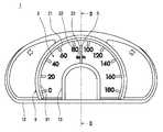 また、以上説明した実施形態は、本発明による車両用指針計器を、自動車のスピードメータ1に適用した場合を例に説明しているが、適用対象をスピードメータ1に限る必要は無く、他の種類の車両用指針計器、たとえば、当該自動車のエンジン回転速度を指示するエンジンタコメータ、エンジン冷却水温度を指示する水温計等に適用してもよい。また、複数個の本発明による車両用指針計器を一まとめに備えるいわゆるコンビネーションメータに適用してもよい。  Moreover, although embodiment described above has demonstrated as an example the case where the pointer instrument for vehicles by this invention is applied to the