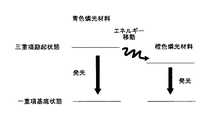 図7は、上記のエネルギー移動材料の作用を模式的に示した図である。図7を参照するに、エネルギー移動材料は、三重項エネルギーが、燐光材料1(図中青色燐光材料と表示)よりも小さく、燐光材料2(図中橙色燐光材料と表示)よりも大きいことが好ましい。この場合、燐光材料1のエネルギーは、一旦エネルギー移動材料に移動し、さらに該エネルギー移動材料に移動したエネルギーは、燐光材料2に移動することになる。上記のエネルギー移動材料は、発光に直接関与しない材料であっても良く、また、正孔輸送材料または電子輸送材料の機能を兼ねる材料であってもよい。  FIG. 7 is a diagram schematically showing the action of the energy transfer material. Referring to FIG. 7, the energy transfer material has a triplet energy smaller than phosphorescent material 1 (indicated as blue phosphorescent material in the drawing) and larger than phosphorescent material 2 (indicated as orange phosphorescent material in the drawing). preferable. In this case, the energy of the