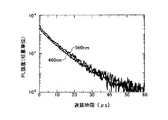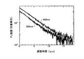また、上記の燐光材料1と燐光材料2の、混合される前の単独でのそれぞれのPLの発光の減衰特性を図4に示す。図4に示す発光特性は、燐光材料1と燐光材料2を、それぞれ個別に化学的に不活性な媒体であるポリカーボネートに添加して形成した膜のPL減衰特性(励起波長355nm)を示すものである。この場合、燐光材料1と燐光材料2の重量濃度比はそれぞれ5重量%とした。  In addition, FIG. 4 shows the attenuation characteristics of the PL emission of each of the
