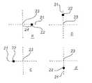 ベース上に適用されるときの実際の位置符号は、簡単なグラフィカルシンボルすなわちマーク22から成り、これらは、基準位置23すなわちラスタ点に対するそれらの位置に応じて、4つの異なる値0〜3であってもよい。図2から分かるように、各シンボル22はドットの形状を有し、基準位置23に対して4つの異なる方向のうちの一方向に距離24だけ移動させてある。基準位置23は、可視、不可視または仮想のラスタ、または格子内のラスタ線21の交点にある。シンボルによって符号化される値は、その変位の方向によって決定される。各シンボル値0〜3は、x座標を符号化するために使用される1ビットと、y座標を符号化するために使用される1ビットとに、すなわちビット(0,0)、(0,1)、(1,0)および(1,1)の対に変換することができる。したがって符号化は、x方向およびy方向に別々に行われるが、グラフィカルな符号化は、xビットおよびyビットに共通のシンボルを用いて行われる。  The actual position code when applied on the base consists of simple graphical symbols or marks 22, which are four different values 0 to 3, depending on their position relative to the