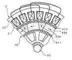 また、主磁極磁石32とヨーク磁石33のそれぞれの軸方向両端には、これらの磁石の軸方向移動を規制するジュラルミン製の基板部313と羽根状放熱部314とが設けられており、これらの吸熱効果によって主磁極磁石32とヨーク磁石33の磁石の温度が大幅に低下してこれらの磁石の特性低下を防止することができるともに、回転中あるいはこれらの磁石自身の反発力による空間隙間が生じにくいので回転バランスが崩れる問題もない。  Further, at both ends in the axial direction of the main