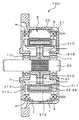 また、回転軸30の一部にはローレット加工部が形成されており、熱良導性の非磁性金属放熱部としてのジュラルミン製のハブ31がこのローレット加工部の外周に嵌入固定される。このハブ31は、径方向延在部310、内側円筒部311、外側円筒部312、基板部313、羽根状放熱部314を備えている。径方向延在部310は、回転軸30に対する嵌合面のほぼ中央から径方向外側に向かって延在しており、さらにその外周に内側円筒部311が形成されている。この内側円筒部311は、径方向延在部310の外周端から軸方向に沿った両側に延在しており、その両端は径方向外側に向かってさらに延在した後、軸方向中央部に向かって延在する外側円筒部312を形成し、さらに両端部は軸方向中央部において溶接により接合された閉じた構造になっている。  Further, a knurled portion is formed on a part of the rotating