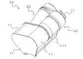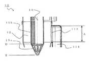 また、排出口体15は、その側壁の一部が、円錐メッシュ15aの大端と連続して設けられ多数の微細孔を持つ略円筒形状の円筒メッシュ15bで構成され、流入口11の軸方向における高さ範囲Bを円筒メッシュ15bの軸方向における高さ範囲内Cとし、かつ円錐メッシュ15aの大端の軸方向における高さ位置Dを、前記0次開口部113の軸方向における開口範囲A外としている(図25参照)。  Further, the