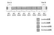 また、図9−1、9−2は、それぞれ、アグリゲーション数が2と4でDistributed送信用のリソースブロックが同じである。このような配置は2と4の最少公倍数の整数倍にあたるリソースブロック数をLocalized用に配置後、Distributed用にリソースブロックを割当てる、というパターンを繰り返すことで可能となる。このような配置は、アグリゲーション数を2と4で時間と共にダイナミックに変更するシステムの場合にも適用できる周波数軸上の配列である。この配列によれば、アグリゲーション数を変えても、常に同一リソースブロックがDistributed送信用に割当てられているため、Localized送信,Distributed送信それぞれに割当てられているリソースブロック数が一定であり、かつLocalized送信においても同じリソースブロックが確保されることになる。Localized送信,Distributed送信それぞれでリソースブロック数が一定であることは、スケジューラアルゴリズムが簡単になることが期待できる。また、同一リソースブロックがLocalized送信およびDistributed送信それぞれで確保されることは、端末に対して割当て情報を一度通知し、その情報で割当てたリソースブロックをそれ以後も同一端末に継続する(図9−3の端末A)、というようなスケジューラアルゴリズムが可能となり、制御情報の削減が可能となる。このようなことは、アグリゲーション数が2と3の間でも、それらの最少公倍数の整数倍を利用することで可能となる。 In FIGS. 9A and 9B, the number of aggregation is 2 and 4, and the resource blocks for Distributed transmission are the same. Such an arrangement can be achieved by repeating a pattern in which the number of resource blocks corresponding to an integral multiple of the least common multiple of 2 and 4 is allocated for Localized, and then resource blocks are allocated for Distributed. Such an arrangement is an arrangement on the frequency axis that can also be applied to a system in which the number of aggregations is dynamically changed between 2 and 4 with time. According to this arrangement, even if the number of aggregations is changed, the same resource block is always allocated for Distributed transmission. Therefore, the number of resource blocks allocated to Localized transmission and Distributed transmission is constant, and Localized transmission. The same resource block is secured in step (b). The fact that the number of resource blocks is constant in each of Localized transmission and Distributed transmission can be expected to simplify the scheduler algorithm. In addition, the fact that the same resource block is secured in each of Localized transmission and Distributed transmission notifies the terminal of the allocation information once and continues the resource block allocated by the information to the same terminal thereafter (FIG. 9-). 3), a scheduler algorithm such as 3) is possible, and control information can be reduced. This is possible even when the number of aggregation is between 2 and 3 by using an integral multiple of the least common multiple thereof.