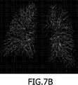 この実施例において、ボクセルレベルで、−600HUの又はそれを上回るハウンズフィールド値を有する全てのボクセルは受け入れられる。拡張は、分岐点で、即ち、伝搬波フロントが分離される場合に、終了される。セグメントレベルで、セグメントはその半径を確認される。半径が最大許容値を超える場合に、セグメントは排斥される。セグメントの最大許容半径rmaxは、rmax=2rparentとして、その親セグメントrparentの実際の半径によって決定される。ツリーレベルで、5mmよりも短い長さの終端セグメントは取り除かれる。ツリー分割の結果は図7A及び7Bに示される。分割の結果は、ひと組のボクセルと、分岐及び親子情報を含む中心線ツリーと、夫々の中心線点に関する血管半径推定とを含む。In this example, at the voxel level, all voxels having a Hounsfield value of -600 HU or above are accepted. The expansion is terminated at the bifurcation point, i.e. when the propagating wave front is separated. At the segment level, a segment is identified for its radius. If the radius exceeds the maximum allowed value, the segment is rejected. The maximum allowable radius rmax of a segment is determined by the actual radius of its parent segment rparent , where rmax = 2rparent . At the tree level, end segments with a length shorter than 5 mm are removed. The result of tree splitting is shown in FIGS. 7A and 7B. The result of segmentation includes a set of voxels, a centerline tree containing branch and parent-child information, and vessel radius estimates for each centerline point.