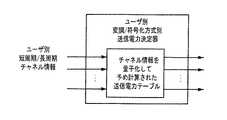 また前記他の目的を達成するための本発明の第2装置は、 適応送信装置において、短周期チャネル情報と長周期チャネル情報との一定範囲を量子化し、それに応じる送信電力を格納している格納手段と、各端末から伝達された短周期チャネル情報と長周期チャネル情報に相応する各ユーザ別、各変調/符号化方式別送信電力を前記格納手段を用いて決定するための送信電力決定手段と、前記送信電力決定手段で決定した各ユーザ別、各変調/符号化方式別必要送信電力に応じてユーザを選択し、ユーザ別に変調/符号化方式を決定するためのスケジューリング手段と、前記スケジューリング手段で選択したユーザに対し、前記決定した符号化方式でユーザトラフィックデータを符号化し、前記決定した変調方式で変調して送信するための符号化/変調及び送信手段とを備える。 The second device of the present invention for achieving the other object is a storage that quantizes a fixed range of short-period channel information and long-period channel information in an adaptive transmission apparatus and stores transmission power corresponding thereto And transmission power determining means for determining the transmission power for each user and each modulation / coding scheme corresponding to the short period channel information and the long period channel information transmitted from each terminal using the storage means, Scheduling means for selecting a user according to the required transmission power for each user and for each modulation / coding scheme determined by the transmission power determination means, and for determining a modulation / coding scheme for each user, and the scheduling means A code for encoding user traffic data with the determined encoding method and modulating and transmitting with the determined modulation method for the user selected in And modulation / modulation and transmission means.