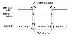 図5は、ラッチ回路1の第2の制御例を示す。スイッチング制御回路41は、ラッチ回路1の動作電圧がvdd1からvdd2へ切り替わると、制御信号s1の論理レベルを“H”に設定してスイッチング素子をオン状態に制御する。一方、ラッチ回路1の動作電圧がvdd2からvdd1へ切り替わると、制御信号s1の論理レベルを“L”に設定してスイッチング素子をオフ状態に制御する。これにより、低電圧によってノイズ耐性が低下する動作電圧vdd2期間に、スイッチング素子をオン状態に制御することにより、記憶ノードの容量を大きくしてデータを安定的に保持することが可能となる。なお、スイッチング素子をオン状態にするタイミングは、記憶ノードの容量が大きくなっても回路動作が可能であれば、動作電圧の切り替わり前であってもよい。(Second control example)