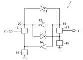 スイッチング素子17及び18は、記憶ノード19と容量素子15との間、記憶ノード20と容量素子16との間にそれぞれ接続され、制御信号s1によってスイッチング動作が制御される。具体的には、スイッチング素子17は、制御信号s1の論理レベルが“H”のときオン状態となり、記憶ノード19と容量素子15とを電気的に接続する。また、制御信号s1の論理レベルが“L”のときオフ状態となり、記憶ノード19と容量素子15とを電気的に遮断する。スイッチング素子18についても同様である。  The