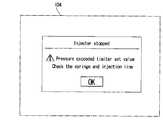 コントローラ101のディスプレイ104には、薬液注入中の、注入状況(例えば、薬液の圧力や注入速度、及び、シリンジ内の薬液の残量など)をリアルタイムに表示することができる。また、ロードセルの検出結果に基づいてピストン駆動機構の動作が停止された際に(図4参照)、例えば図8の画面104に示すような、注入動作が停止された旨のアラームを表示してもよい。特には、薬液注入経路が正確に確保されているかどうか、及び、注入経路を再設定させるためのアラームが表示されるようになっていてもよい。  On the