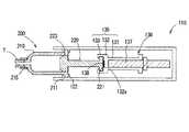 シリンジ200は従来一般的なものであり、筒状のシリンダ部材210と、それにスライド自在に挿入されたピストン220と、を有している。シリンダ部材210の先端(図示上側)には、不図示のチューブが接続される導管部215が形成されている。シリンダ部材210の後端にはフランジ部211が形成されている。