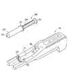 図1に示すように、凹部114の長さ方向ほぼ中央には、シリンジ200のフランジ部211(詳細下記)を保持するための保持部材122、122が設けられている。保持部材122、122は、フランジ部211を両側から挟んで保持する一対の部材であり、シリンダ部材210のフランジ部211が挿入される円弧状の溝を有している。  As shown in FIG. 1, holding
