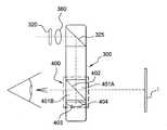 レンズ300内には、プリズム401Aと、バッキングプリズム401Bと、四分波プレート404と、マンジャン鏡403とから構成された光学結像器インサート400が埋め込まれている。光学結像器インサート400は、薄膜の被覆物の形で実施することができる偏光分離処理部402を備えている。
