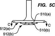 [0024]図5A−図5Gは、本発明の更に他の実施形態に従うガス分配装置500の様々な図を示す。ガス分配装置500は、洗浄ガス通路514と、2つの段部(段部512(a)、段部512(b))を含む。段部512(a)と段部512(b)は、ガス分配装置面504で、各々が、一組のアパーチャを統合している。段部の数を増やすことにより、ガス分配の更なる調整を可能にし、均一性を改善する。段部512(a)に含まれたアパーチャの数と位置は、段部512(b)と異なってもよい。たとえば、アパーチャ510(a)、510(b)は、中心点518から放射方向に整列されていない。  [0024] FIGS. 5A-5G show various views of a