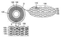図5を参照すれば、本発明に係る光記録媒体はリードイン領域100、使用者データ領域120及びリードアウト領域130を含み、前記リードイン領域100、使用者データ領域120及びリードアウト領域130はグルーブ123とランド125よりなっており、前記グルーブ123及びランド125の少なくとも一方にはウォッブル105、135が形成されていることを特徴とする。ここで、使用者データ領域120の一部(E部)及びリードアウト領域130の一部(D部)を拡大して示し、部材番号110はレーザービームを示す。Hereinafter, the present invention will be described in detail with reference to the accompanying drawings.
