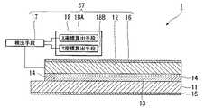検出手段17は、図1に示すように、端子部54を介して検出電極51、52に交流電圧を印加し、偏光板16及び被覆膜55を介して検出電極51、52との間の静電容量を検出して指などを接触させていない基準状態において検出される電圧と、指などを接触させた状態において検出される電圧との差を静電容量の変化量として検出する構成となっている。