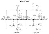 また、インバータ回路26fの入力端子はPチャネルMOSトランジスタTp3,Tp4を介して電源VDDに接続され、NチャネルMOSトランジスタTn3,Tn4を介してグランドGNDに接続されている。前記トランジスタTp3,Tn4のゲートはインバータ回路26dの出力端子に接続され、前記トランジスタTp4,Tn3のゲートはインバータ回路26fの出力端子に接続されている。  The input terminal of the inverter circuit 26f is connected to the power supply VDD through P channel MOS transistors Tp3 and Tp4, and is connected to the ground GND through N channel MOS transistors Tn3 and Tn4. The gates of the transistors Tp3 and Tn4 are connected to the output terminal of the