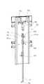 また、ガイド部2のガイド部本体11の上端部には、可動部3の可動部本体16を引っ張ることにより、可動部3を上方に向けて付勢する上方付勢手段21が取り付けられている。上方付勢手段21は例えばコイルばねである。更に、下端規制部材13のやや上方には、下端位置係止部材22が設けられている。下端位置係止部材22は、延出部18が下端規制部材13に当接することにより可動部3が移動域の下端に位置しており、アーム17の角度が第1の角度になっているときに、下端規制部材13との間で延出部18を挟む位置に設けられている。そして、下端位置係止部材22は、アーム17が第1の角度にあるときには、延出部18の上方への移動を規制し、アーム17が第2の角度にあるときには、延出部18の上方への移動を規制しない。これにより、アーム17が第1の角度にあるときに、延出部18は下端規制部材13と下端位置係止部材22との間で係止され、可動部3はその移動域の下端位置で固定される。  Further, an upper biasing means 21 that biases themovable part 3 upward by pulling the movable partmain body 16 of themovable part 3 is attached to the upper end of the guide partmain body 11 of theguide part 2. . The upper biasing means 21 is, for example, a coil spring. Furthermore, a lower endposition locking member 22 is provided slightly above the lowerend regulating member 13. The lower endposition locking member 22 is configured such that themovable portion 3 is positioned at the lower end of the moving area due to theextension portion 18 coming into contact with the lowerend regulating member 13, and the angle of thearm 17 is the first angle. In addition, theextended portion 18 is provided between the lowerend regulating member 13 and theextended portion 18. The lower endposition locking member 22 restricts the upward movement of theextension 18 when thearm 17 is at the first angle, and the lower endposition locking member 22 of theextension 18 when thearm 17 is at the second angle. Does not restrict upward movement. Thus, when thearm 17 is at the first angle, the extendingportion 18 is locked between the lowerend regulating member 13 and the lower endposition locking member 22, and themovable portion 3 is at the lower end position of the moving range. Fixed.