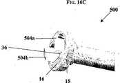望み通りの数の脊柱アンカリング装置を埋め込んだら、テザー50のような脊柱固定要素を各装置の間に張るように位置づけることができる。図16Aは、脊柱アンカリング装置10、10’の間に延びるテザー50を図示している。次にロック用アセンブリを各脊柱アンカリング装置10、10’に取り付け、テザー50を各脊柱アンカリング装置10、10’に対して固定することができる。図16Aに示されているように、ファスナーインサーター工具500を締結要素、たとえば、ワッシャー16およびロック用ナット18を取り付けるのに使用することができる。例示的なインサーター工具500は、図16B、および図16Cにより詳細に示されているが、概して細長いシャフト部502を有し、このシャフト部502の遠位端は、実質的に円柱形をしていて、向かい合ったアーム部504a、504bが形成されている。アーム部504a、504bは、ワッシャー16の支柱部36を収容し、この支柱部36に連結し、ワッシャー16ならびにワッシャー16の周りに配置されているロック用ナット18をインサーター工具500に結合させるように構成されている。次に、インサーター工具500を操作して、ワッシャー16およびロック用ナット18をステープルボディ12のアーム部20a、20bに位置づけることができる。  Once the desired number of spinal anchoring devices have been implanted, a spinal fixation element such as