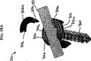 特定の態様では、アンカリング装置に、通路内に延び、テザーを実質的に固定された位置に保持するように構成された少なくとも1つのテザー連結特徴部があってもよい。テザー連結特徴部は、たとえば、テザーを囲むように配置されるよう構成されたクリップであってもよい。他の実施形態では、テザー連結特徴部が、ステープルの上面に形成された、少なくとも1つの対応する相補的な溝部内に入るように、ワッシャーの下面に形成された隆起部であってもよい。隆起部および溝部は、これらの隆起部および溝部の間にテザーを連結するように構成されていていてもよい。 In certain aspects, the anchoring device may have at least one tether coupling feature that extends into the passage and is configured to hold the tether in a substantially fixed position. The tether connection feature may be, for example, a clip configured to be placed so as to surround the tether. In other embodiments, the tether coupling feature may be a ridge formed in the underside of the washer so as to enter into at least one corresponding complementary groove formed in the top surface of the staple. The raised portion and the groove portion may be configured to connect a tether between the raised portion and the groove portion.