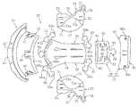 例えば、上述の実施例においては、カバー構成体31〜34、36、37を互いに組み合わせて結合する1種類の結合手段として、一方のカバー構成体に差し込み係合部を設けるとともに、他方のカバー構成体に上記差し込み係合部を差し込み係合するためのスリット状開孔を設けたものを用いている。また、別の1種類の結合手段として、ダルマ穴利用の凹凸係合手段78、96a、96bを用いている。しかし、上記結合手段は、面ファスナであってもよく、このような面ファスナは、通常、マジックテープ(商標)、ベルクロ(商標)などと称されている。そして、このような面ファスナは、通常、一方のカバー構成体に設けられる面部材が多数個のループ状フックを有するとともに、他方のカバー構成体に設けられる他方の面部材が多数個の非ループ状フック(換言すれば、各ループ状フックの1箇所に切断箇所が設けられたフック)を有している。また、上記結合手段は、上記2(4)項に記載した丸型ホックのようなホックであってもよく、この場合、一方のカバー構成体に雄型ホックが設けられるとともに、他方のカバー構成体に雌型ホックが設けられればよい。  For example, in the above-described embodiment, as one type of coupling means for coupling the