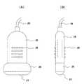 次に、本実施例の特徴である自動圧迫装置3の詳細構成を図1を用いて説明する。図示のように、本実施例の自動圧迫装置3は、探触子2が着脱自在に装着される探触子保持具21と、圧迫駆動制御部22(図5に示す。)を構成する圧迫動力部24と、探触子保持具21と圧迫動力部24を連結する動力伝達ワイヤ23を含んで構成されている。本実施例の探触子2は、図3(A)の正面図及び同図(B)の側面図に示すように、扁平な容器状に形成されたケーシング25と、ケーシング25の図において下端に設けられた振動子部26を有して形成されている。振動子部26の図において下面が超音波送受面27となっている。ケーシング25の表裏面には、探触子2を手で把持するときの滑り止め用に複数の突条28が設けられている。また、ケーシング25の頂部からケーブル29が引出され、図1に示した送信回路5及び受信回路6に接続可能になっている。  Next, a detailed configuration of the