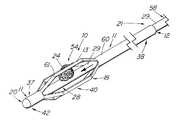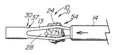図17から図18は、バスケットを開いて結石24を回収するため、外部拘束機構ではなく起動部材29を含む、図1の装置10の代替実施態様の絵画的図を示す。図18は、起動部材29が前進して、結石24上で弾性把持部材13を閉じた、図16の回収装置10の絵画的図を示す。起動部材29の遠端42は、はんだ付けまたは他の方法で装置10の遠端20に取り付ける。拡張していない装置が内視鏡または導入器のシース内に含まれる間、起動部材29は十分に前進した位置にある。把持部材13が露出すると、起動部材29を引き戻してバスケット54を開放または拡大形状18になるよう操作し、次にこれを所定の位置にロックすることができる。バスケットを閉じるには、起動部材29をほぼ閉位置30へと十分に前進させ、結石24を罠に入れる。起動部材29は、ロック用ハブまたは他の周知の手段により装置の近端38で所定の位置にロックし、身体から引き出す間に結石24が誤って解放されるのを防止することができる。  FIGS. 17-18 show pictorial views of an alternative embodiment of the