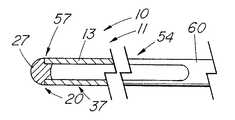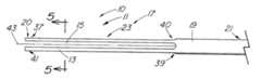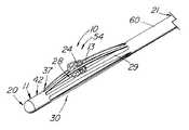 図20は、強化ワイヤ31が螺旋形に巻いているのではなく、細長部材11の縦軸43と整列する、本発明の別の好ましい実施態様を示す。このタイプのバスケットは、通常は、ワイヤがプラスチック管32の遠端を出るにつれ、それを方向転換または切断する必要がない。  FIG. 20 shows another preferred embodiment of the present invention in which the reinforcing