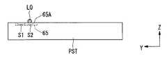 図7Bは、図7Aに示す状態から所定時間経過後の液体LQの状態を模式的に示した断面図である。スリット板65上の液体LQの稜線の移動に伴って、やがて、図7Bに示すように、液体LQの端部LG2が第2パターン80のラインパターン81の内側に入り込む。ラインパターン81の内側に入り込んだ状態においても、ラインパターン81の内側面を形成する遮光膜62の液体LQとの接触角θ2が維持されようとするため、図7Bの符号Jで示すように、ラインパターン81の内側に入り込んだ液体LQの端部LG2の稜線が凹むように変形する。すると、液体LQには、ラインパターン81の内側面に接触したまま、液体LQの表面張力によって、凹んだ領域Jを元に戻そうとする力(膨らませようとする力)、すなわち液体LQの形状を維持しようとする力が発生する。この力により、第1パターン61に接触している液体LQの端部LG1がラインパターン81(第2パターン80)側に移動する現象が生じる(矢印y3参照)。このように、スリット板65の上面65Aに凹部からなる第2パターン80を設けておくことで、第2領域S2の液体LQは動きにくくなり、第2パターン80を有する第2領域S2は液体LQに対する親和性を向上されたように振る舞い、液体LQを保持する能力が増す。  FIG. 7B is a cross-sectional view schematically showing the state of the liquid LQ after a predetermined time has elapsed from the state shown in FIG. 7A. As the ridgeline of the liquid LQ on the