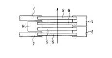 基板1の平坦面に設けられたX軸センサ2およびY軸センサ3をなす巨大磁気抵抗素子2a、2b、2c、2d、3e、3f、3g、3hについての構造は、図2に示すように、4個の感磁部5、5・・と3個のバイアス磁石部6、6・とから構成され、感磁部5、5・・のうち、両外側の2個の感磁部5、5のバイアス磁石部6が接続されていない端部には、配線層7、7が接続され、この配線層7、7は、図示しないビア部に接続されている。  The structures of the giant