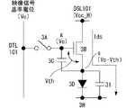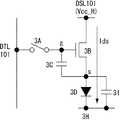 しかしながら、駆動用トランジスタ(1B)の製造プロセスのばらつきにより、各画素ごとに閾電圧や移動度等の特性変動がある。この特性変動により、駆動用トランジスタ(1B)に同一のゲート電位を与えても、画素毎にドレイン電流(駆動電流)が変動し、発光輝度のばらつきになって現れる。また、有機ELデバイス等から成る発光部(1D)の特性の経時変動により、発光部(1D)のアノード電位が変動する。アノード電位の変動は、駆動用トランジスタ(1B)のゲート−ソース間電圧の変動となって現れ、ドレイン電流(駆動電流)の変動を引き起こす。この様な種々の原因による駆動電流の変動は、画素ごとの発光輝度のばらつきとなって現れ、画質の劣化が起きる。However, due to variations in the manufacturing process ofthe driving transistor (1B), there are variations in characteristicssuch as threshold voltage and mobility for each pixel. Due to this characteristic variation, even if the same gate potential is applied to the driving transistor (1B), the drain current (driving current) varies from pixel to pixel, resulting in variations in light emission luminance. Further, the anode potential of thelight emitting unit (1D) varies due to the temporal variation of the characteristics of thelight emitting unit (1D)made of an organic EL deviceor the like . The fluctuation ofthe anode potential appears as a fluctuation of the gate- source voltage ofthe driving transistor (1B) and causes a fluctuation of the drain current (driving current). Such fluctuations inthe drive current due to various causes appear as variations in light emission luminance for each pixel, resulting in degradation of image quality.