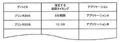 そして、図3(B)に示される例ではアプリケーションD,E,Fによりそれぞれ、「60分間隔」、「120分間隔」、「10:00」と指定されるように、アプリケーションによる指定に送信間隔と時刻が混在している。ここで、現在時刻を9:30とした場合には、現在時刻に最も近いタイミングとして、アプリケーションFにより指定される「10:00」が選択される。次に、プリンタ20から10:00にポーリング信号が送信された場合には、その60分後の「11:00」が送信タイミングとして決定される。  In the example shown in FIG. 3B, the applications D, E, and F transmit the designation by the application so as to designate “60 minutes interval”, “120 minutes interval”, and “10:00”, respectively. Interval and time are mixed. Here, when the current time is 9:30, “10:00” designated by the application F is selected as the timing closest to the current time. Next, when a polling signal is transmitted from the