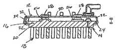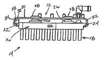 ブラシ14を連結装置12から取り外すために、以下のステップを用いることができる。角度の付いた突起38を、スロット32によって画定される経路と実質的に交差しない位置へ移動させるように突起38に隣接するレバー40に力を加えることができる。突起38が、ブラシ14の取り外しを妨げない位置へ移動すると、ブラシ14を、挿入された方向とは反対の方向へ引くことによって連結装置12から取り外すことができる。  In order to remove the
