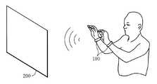 同様に、指の動き検出装置100は、手の動作に対応する制御信号を生成し、ブルートゥースやRFなどのような無線通信方式を用いて制御信号を制御機器200に送信する。したがって、制御機器200は、指の動き検出装置100から出力される制御信号に基づいて再生、次の曲または前の曲への転換、音量調節などのような制御を行う。  Similarly, the finger
